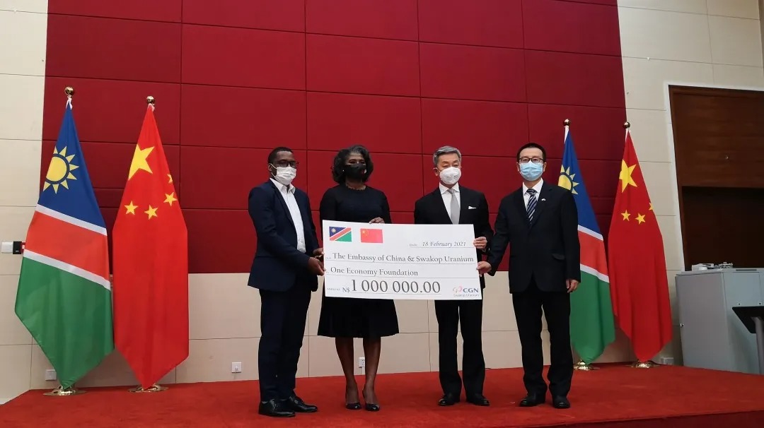 克日,,,,,,,,中广核铀业斯科有限公司(简称“斯科公司”)团结中国驻纳米比亚使馆配合向纳米比亚第一夫人基金会(One Economy Foundation)捐钱100万纳元(约合人民币44万元),,,,,,,,用于外地青少年生长事业。。。。。捐钱交接仪式在大使馆举行,,,,,,,,纳米比亚第一夫人根哥布、中国驻纳米比亚大使张益明、斯科公司副总裁邱斌等加入捐赠仪式。。。。。